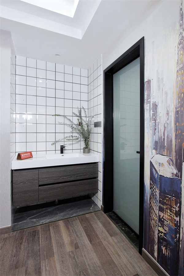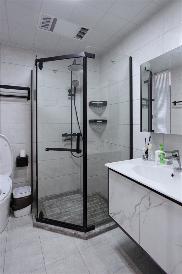 一樓衛生間以黑白色調為主,鉆石型淋浴房為衛生間劃分出不同功能區域。黑白鏡柜組合強化收納,臺下盆設計更便于日常清潔。