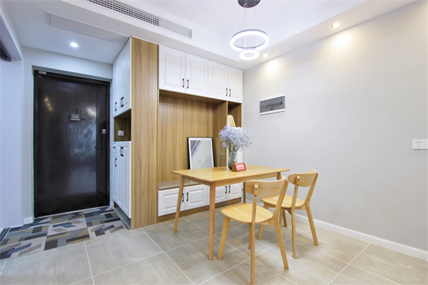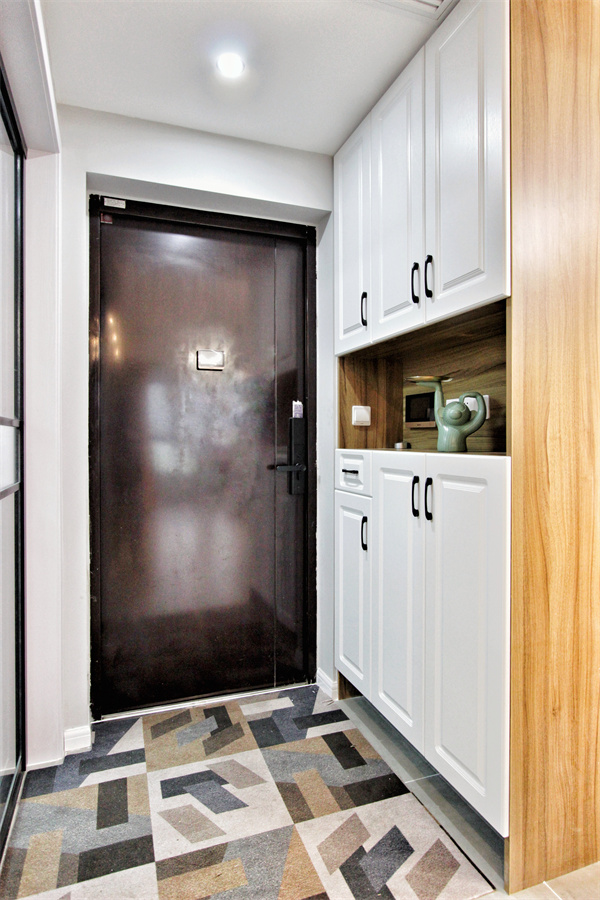 入戶為短廊式玄關(guān),筒燈照明,不做花哨的雕刻,呈現(xiàn)簡(jiǎn)明的視覺(jué)效果。經(jīng)典的白色玄關(guān)柜,搭配黑色把手,增加抽屜,便捷收納,中腰留空,既可置物,也能作為換鞋扶手。