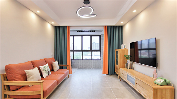 客廳空間利用原木以及大量橙色,營(yíng)造溫暖舒適的空間氛圍。原木矮柜加上邊斗柜,組合為電視柜,木料元素為客廳空間塑造清新自然溫度。