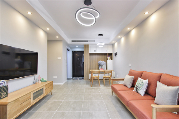 主體為客餐廳一體化,灰色地磚通鋪,點(diǎn)綴白色美縫線條,簡(jiǎn)約吊頂,利用筒燈增加空間層次,營(yíng)造舒適暖居。