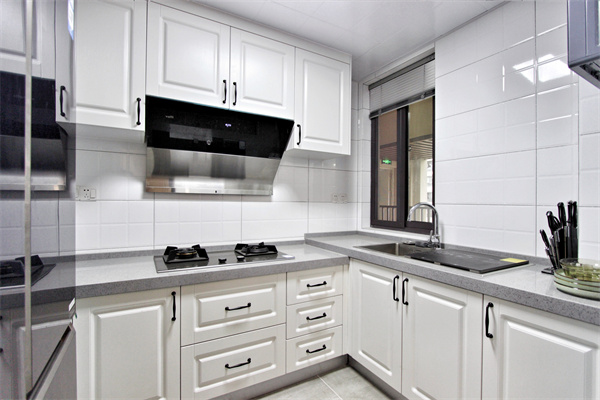 廚房選用的是白色模壓柜門(mén),塑造一種田園小資風(fēng)格,一側(cè)留出足夠雙開(kāi)門(mén)冰箱嵌入的空間,使廚房空間更加整體。利用吊柜遮擋油煙機(jī)管,另一側(cè)不做吊柜處理,使廚房空間更加通透,以白為主,純凈宜人。