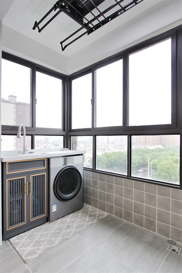 陽(yáng)臺(tái)與客廳無(wú)移門(mén)隔絕,目的是為了讓客廳空間更加通透,塑造更為開(kāi)放的居室。定制陽(yáng)臺(tái)柜兼具盥洗功能,滾筒洗衣機(jī)完美嵌入其中,抽拉式水龍頭使用起來(lái)更加方便。