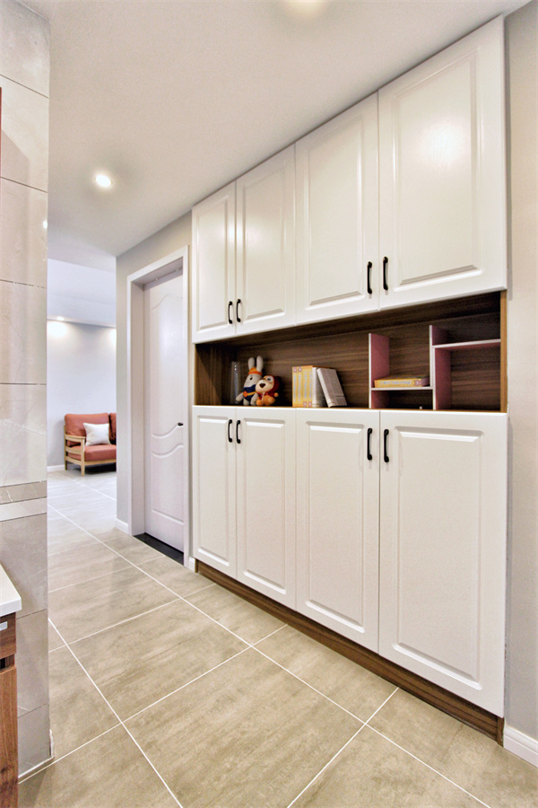 走廊空間毫無(wú)分界感,通鋪地磚,以筒燈為引,往室內(nèi)延伸。一側(cè)墻體做收納柜,中腰留空,集收納與展示與一體,與全屋風(fēng)格一致的白色柜門(mén),在視覺(jué)上更令人舒心。