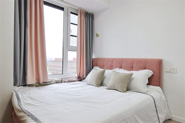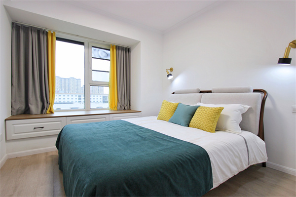 主臥以簡(jiǎn)約為主,墻面粉刷白色塑膠漆,素雅干凈,飄窗臺(tái)定制收納抽屜,增加儲(chǔ)物。床頭兩側(cè)安裝可調(diào)節(jié)壁燈,集中床頭光源,飄窗臺(tái)亦可充當(dāng)床頭柜的角色,無(wú)床頭柜的設(shè)計(jì)使空間不那么擁擠。