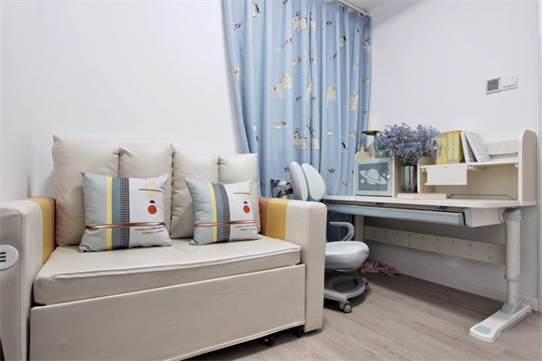 在有限的空間中,開(kāi)辟出一塊學(xué)習(xí)空間,書(shū)桌提供學(xué)習(xí)功能,而小沙發(fā)拉出后也兼顧了客房功能。設(shè)計(jì)師充分將每一個(gè)空間功能發(fā)揮到極致,即使是小小書(shū)房,也擁有整面墻的儲(chǔ)物空間。
