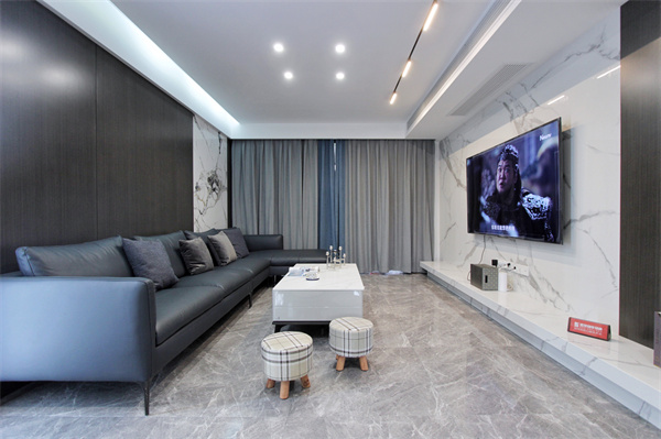 電視背景墻采用大理石上墻,一側(cè)為木質(zhì)護(hù)墻板,彰顯品質(zhì),底部地臺(tái)設(shè)計(jì),增加置物區(qū)的同時(shí),使客廳空間更加豐富。