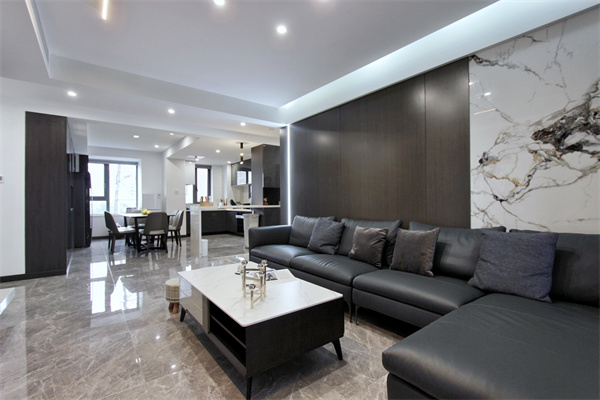 客餐廳整體皆以深色木料與大理石為主,空間干凈通透,營(yíng)造低調(diào)奢華的黑白灰空間。沙發(fā)背景墻面主要采用深色木質(zhì)護(hù)墻板,搭配含有明顯紋理的大理石,增加藝術(shù)感。