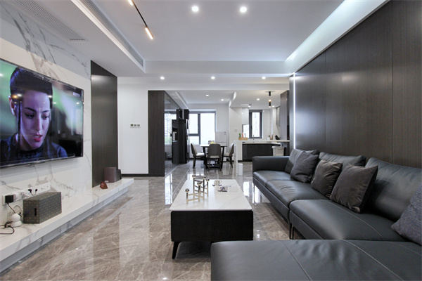 客餐廳地面通鋪灰色大理石地磚,無(wú)線條分隔,整體統(tǒng)一美觀,屬時(shí)下流行。無(wú)主燈設(shè)計(jì),以磁吸燈與筒燈為主照明,吊頂處與沙發(fā)背景加以燈帶處理,增加空間層次感。