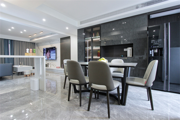 由餐廳視角向客廳空間觀看,整體風(fēng)格統(tǒng)一,以走廊為分隔,小吧臺(tái)作為其半隔斷處理,獨(dú)具格調(diào)。餐廚一體,以吊頂高低面為區(qū)分,二者依舊為無(wú)主燈設(shè)計(jì),依靠筒燈照明,給生活多一些浪漫。六人座方桌足以容納多人用餐,而另一邊的開放式廚房,更是增添了二者的互動(dòng)性。