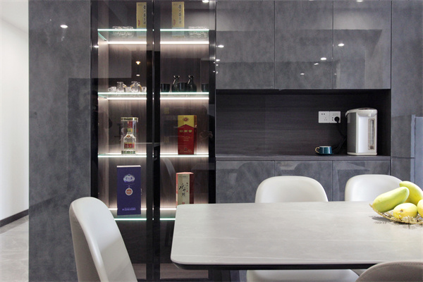 餐邊柜為深色定制櫥柜,透明展示格內(nèi)置燈帶,放置業(yè)主自己收藏的白酒與酒杯。而另一側(cè)將冰箱內(nèi)嵌,雙開門冰箱內(nèi)置制冰機(jī),也是生活品質(zhì)的體現(xiàn)。餐邊柜與廚房廚柜均為暗色系,搭配白色系吊頂與墻面,讓空間更有層次感。