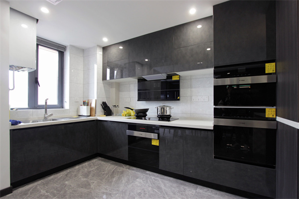 開放式廚房墻面以瓷磚為主,避免油煙污染,難以清理,與玄關(guān)客廳的吧臺(tái)隔斷,是廚房成為一個(gè)獨(dú)立空間。蒸箱、烤箱、洗碗機(jī)內(nèi)嵌柜體之中,避免了電器的雜亂擺放,增加空間之需。深灰色系櫥柜有種典雅高貴的美感,無(wú)拉手的設(shè)計(jì),更是使廚房空間變得簡(jiǎn)潔明了。
