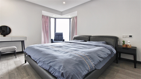 朝南的主臥空間并不算方正,角落為異形小陽(yáng)臺(tái),設(shè)計(jì)師為了體現(xiàn)空間整體性,將其攬入室內(nèi)空間。床體的擺放正好避免了濃烈刺眼的陽(yáng)光照射,卻也能在第一時(shí)間被清晨叫醒。