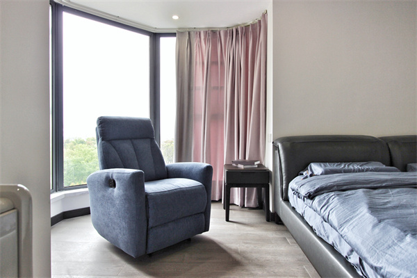 整面落地窗留住了自然景觀,放置一個(gè)休閑沙發(fā),低頭品茗,或是放空自己。角落擺上梳妝臺(tái),安靜的一角,頂部為梳妝臺(tái)留下一盞筒燈,均勻分布光源。