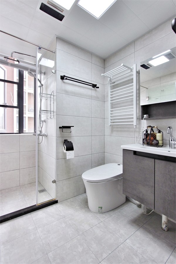 衛(wèi)生間設(shè)計(jì)給人一種清冷感,在于其灰白色的瓷磚鋪貼,拉伸空間高度,整體更為干凈明亮。電熱毛巾架突顯生活品質(zhì),灰色鏡柜浴室柜使衛(wèi)生間不過于浮動(dòng)。