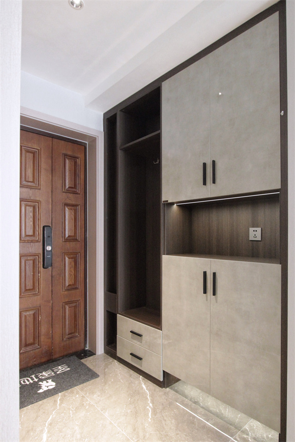入戶玄關(guān)由透明樓梯做隔斷效應(yīng),玄關(guān)與多個(gè)空間的無縫交流,塑造了空間的多重性。淺灰色柜面,散發(fā)高雅卓越的低調(diào)氣質(zhì),隱藏式收納與開放式收納結(jié)合,蘊(yùn)藏平淡與不凡。整體為歐派定制柜,柜體內(nèi)置燈帶,提升空間氣質(zhì),強(qiáng)化木料質(zhì)感,打破空間單一。整體空間多用溫潤的石材,減少入戶景觀的厚重感,增添輕盈質(zhì)感。
