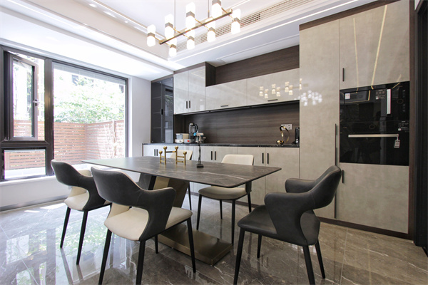 無論是餐邊柜、餐桌椅、還是地面頂面,對于材質(zhì)紋理的拿捏,設(shè)計(jì)師處理得似乎恰到好處。六人位的餐桌滿足一家人的用餐需求,餐邊柜可作為西廚,嵌入烤箱蒸箱。