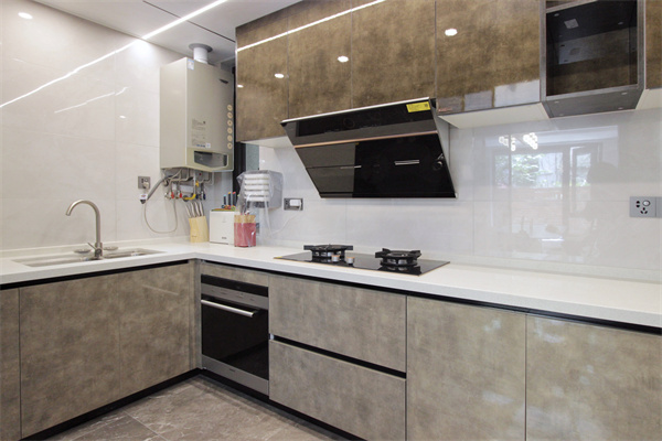U型廚房布局,給主人充分的活動(dòng)空間,點(diǎn)綴一絲綠意,兼容美學(xué),浸透于自然。廚房照明以頂面的燈帶與筒燈為主,去繁存簡,而灰褐色的廚柜與白色臺(tái)面搭配,給空間注入溫暖。