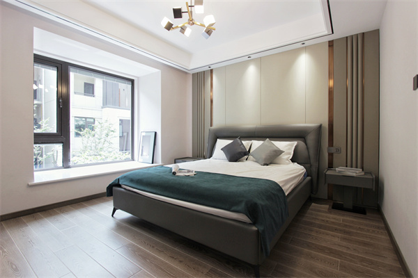 軟包背景墻面,兩側(cè)點(diǎn)綴金屬線條,米、白、灰的三色搭配,安逸而寧靜。