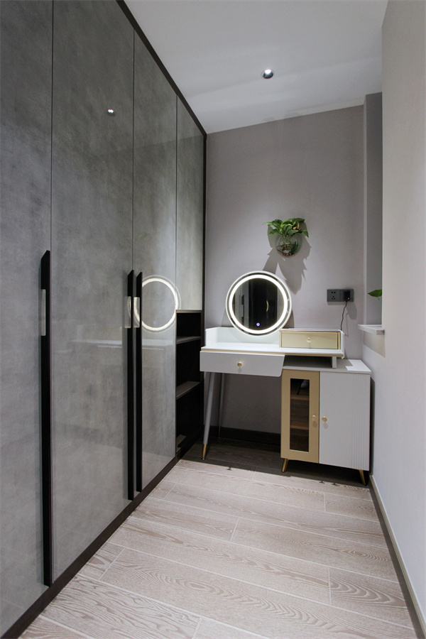 獨(dú)立衣帽間內(nèi)置梳妝臺(tái),一側(cè)的小窗臺(tái)增加空氣流通,墻面的綠植賦予空間生機(jī)。步入式的格局,擴(kuò)大衣帽間的收納區(qū)域,茶色透明柜門與灰色柜門搭配,讓收納有顯有藏。