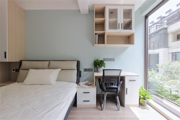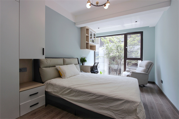 整體色調(diào)更偏向于環(huán)保主題,原木色柜子與白色柜門搭配,簡潔明了。在保證了充分的收納空間后,設(shè)計(jì)師把床體兩側(cè)利用定制處理床頭柜,將實(shí)用性和整體性做到最大化。