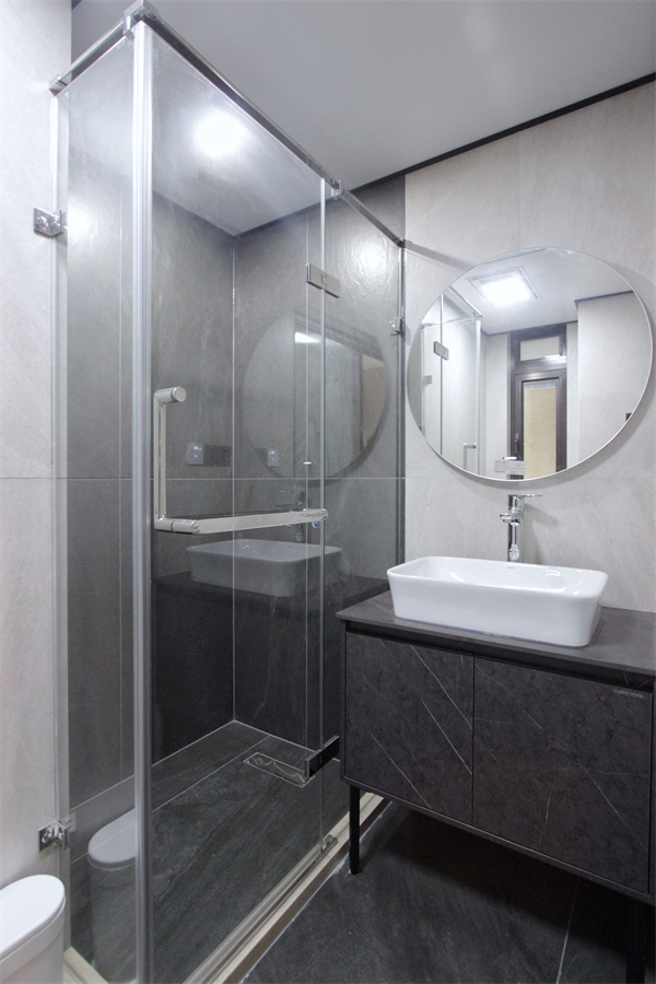 公衛(wèi)干濕分離,干區(qū)獨(dú)立于外,馬桶水箱隱藏,上方設(shè)計(jì)壁龕,增加隱性收納。內(nèi)衛(wèi)保證功能性齊全,角落利用淋浴房做干濕分離,黑白灰、冷暖調(diào)串聯(lián)著人與空間的對話。