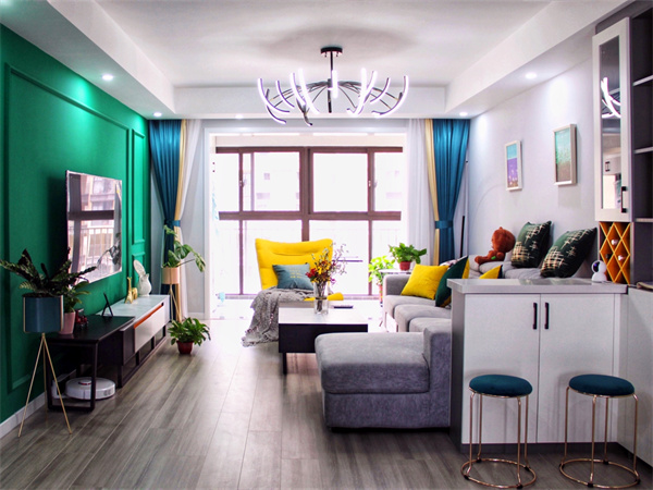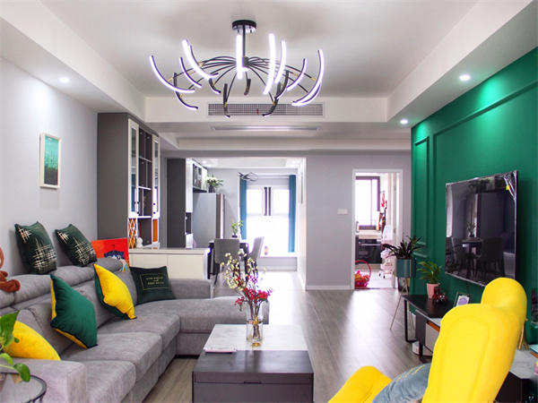 客廳整體通透且富有層次,整面電視墻使用跳躍的綠色,使整個空間元素相呼應。