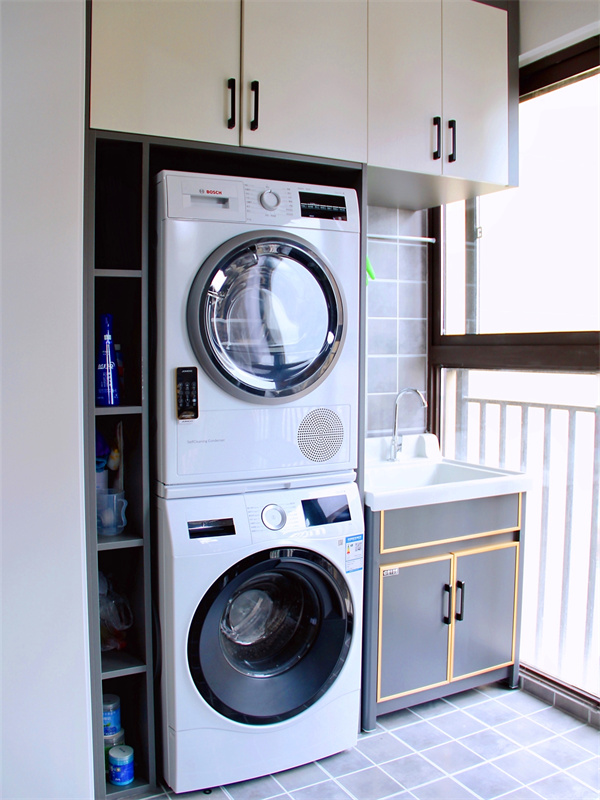 陽臺既是晾曬衣物的地方,也是洗衣房,滾筒洗衣機和烘干機的收納方式,讓人怎能不心動。