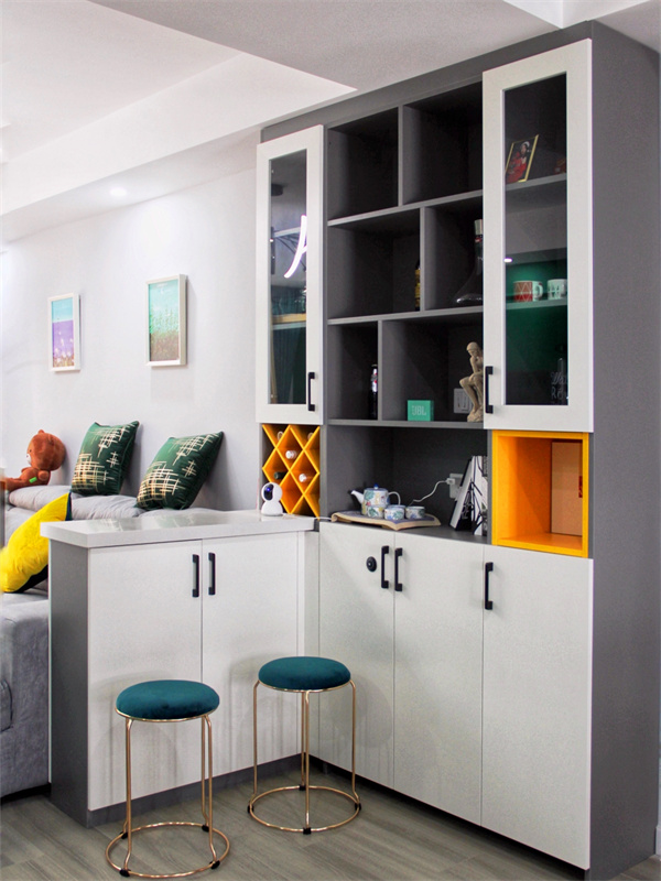 隔開客廳與餐廳的便是入戶就能看見的水吧臺。他也是客廳的補充空間,獨立出來的水吧臺是具有巧思的休閑小空間。