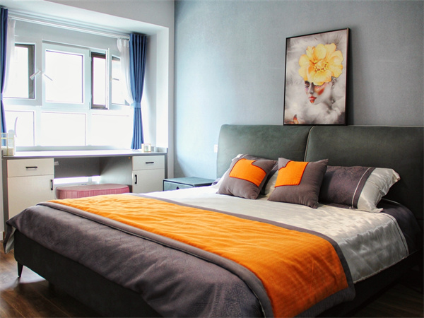 主臥溫馨自在,女主人將落地飄窗改為梳妝臺,將預留梳妝臺的位置放上一個貓爬架,給小貓一個自在的游戲空間。主臥整體為灰色調,暖色燈光照明,給臥室帶來一絲溫馨與靜謐。