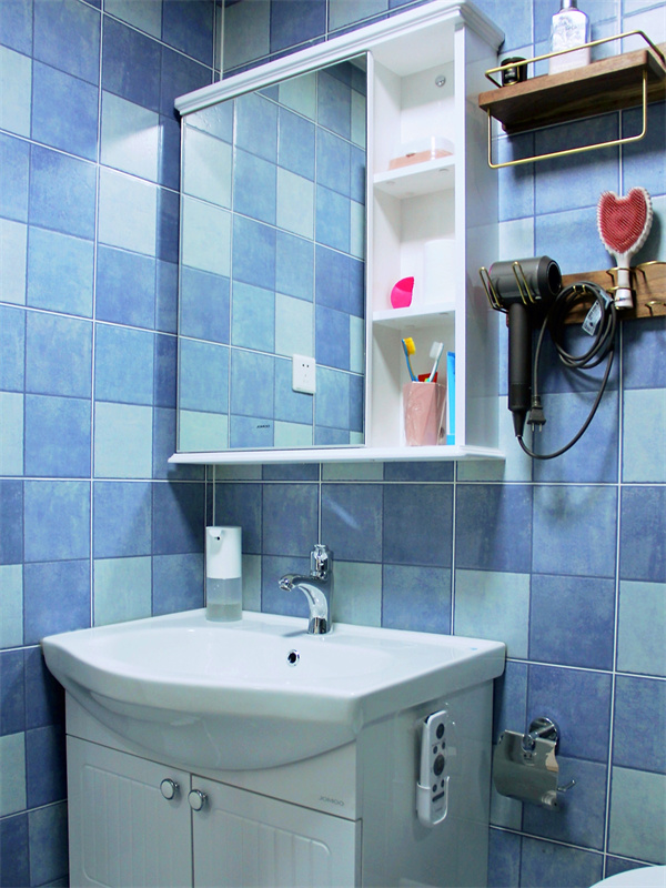 藍色的格子瓷磚鋪滿整個洗手間,防水防潮易清潔。與外界的色調產生一絲反差,也是一種獨特的裝飾風格。
