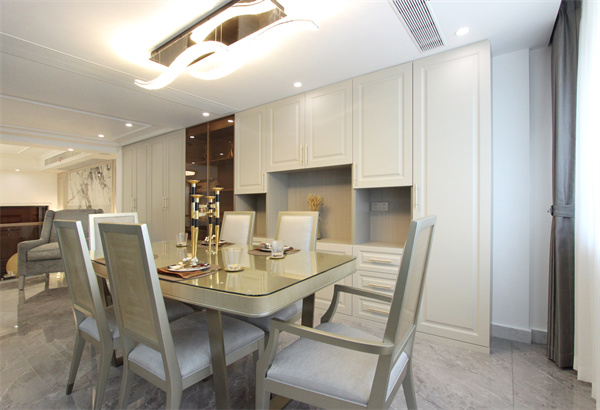 美式風格的餐桌椅,具有很好的質感,光影映照在餐具表面,細節凸顯在眼前,配以玻璃杯,呈現滿滿的生活設計感。簡潔色調讓餐廳空間看起來賞心悅目,注重功能和空間組織,自然的氣韻自由穿梭,彰顯出一種雅致的情調。