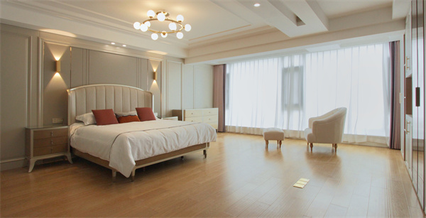 女兒房傳達著一份甜蜜安靜的視覺美感,溫潤自然的色調,營造出舒心的睡眠環境。大面積的落地窗,帶入充足的自然光線,彰顯平和自在。美式雙人軟床加以素雅舒適的床品,配合圓形吊燈,在浪漫的氛圍中表達生活的儀式感。
