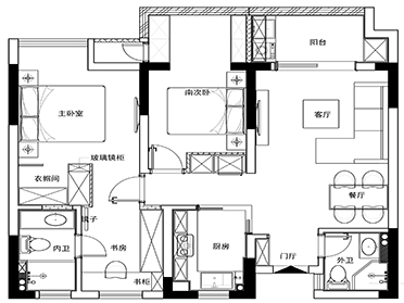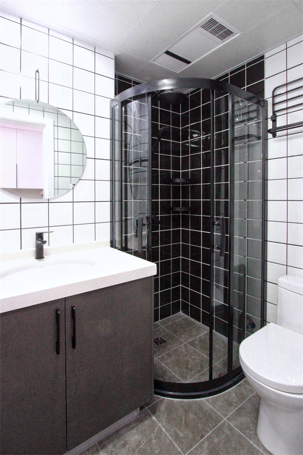 外衛(wèi)采用黑白調(diào)色彩,注入時尚元素,利用黑白區(qū)分干濕兩區(qū),格局明確。內(nèi)衛(wèi)將浴室柜收納做大,馬桶旁設置開放格,方便拿取。