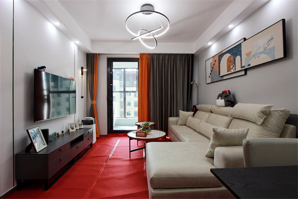 電視機墻面使用石膏線,兩邊的壁燈造型獨特,讓靜謐的夜晚更加溫馨。高低圓形茶幾使客廳空間更加整體,橙灰拼接窗簾增加空間韻律感,墻體采用水泥灰與白色墻面漆讓空間更加沉穩(wěn),簡單的拼接色彩,讓整體空間看起來時尚而低調(diào)。