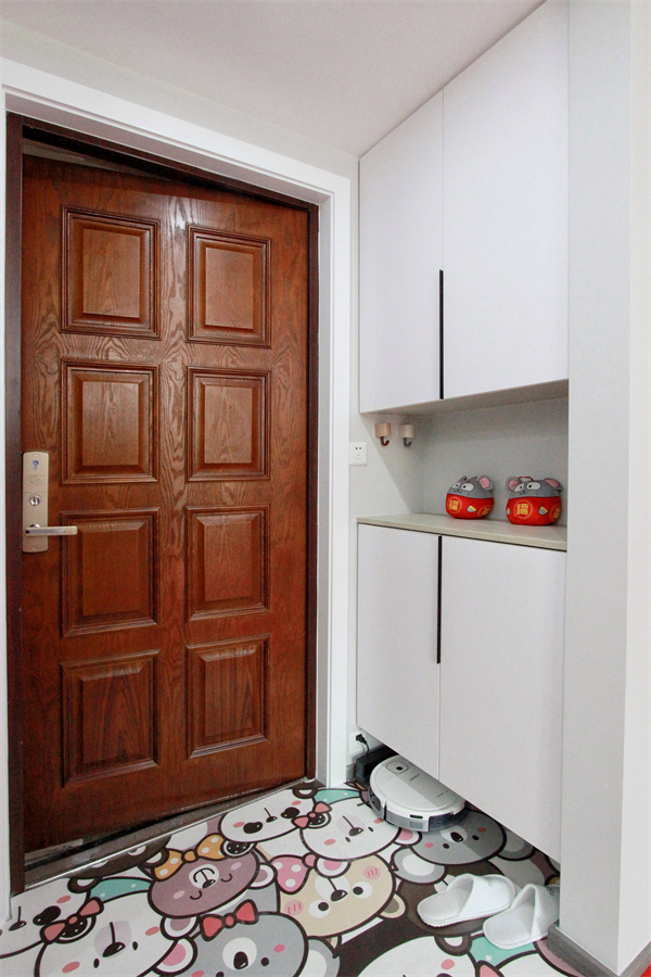 房屋大門外開,節(jié)省室內(nèi)空間,玄關柜屹立入門處,中空展示柜放上獨特的小物件,也能放些隨手物件,卡通地墊充滿童心,鞋柜下方留空,方便進出換鞋。