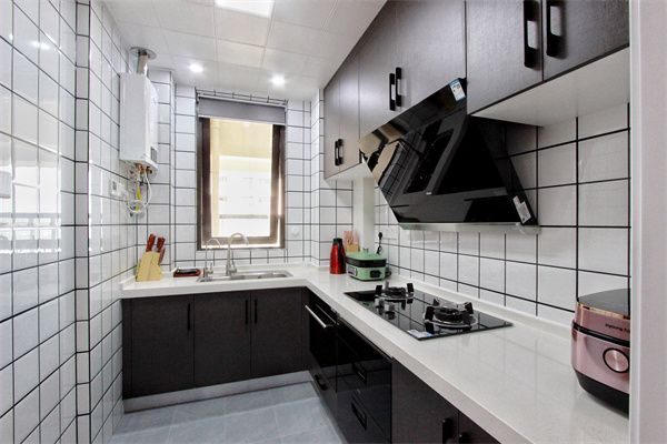 明亮、開闊的廚房會讓做飯的人擁有好心情。小方格造型墻磚增加空間動感,黑色櫥柜穩(wěn)重大氣,L形廚房充分利用空間,再也不會雜亂無章。