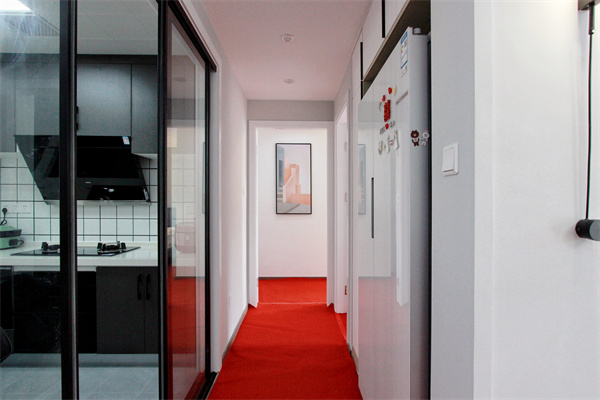 廚房使用玻璃墻面,給人一種半開放的感覺,同時顯得空間更加明亮寬闊,減緩視覺疲勞。幽深的走廊直通主臥,另一端則是與餐廳相對。