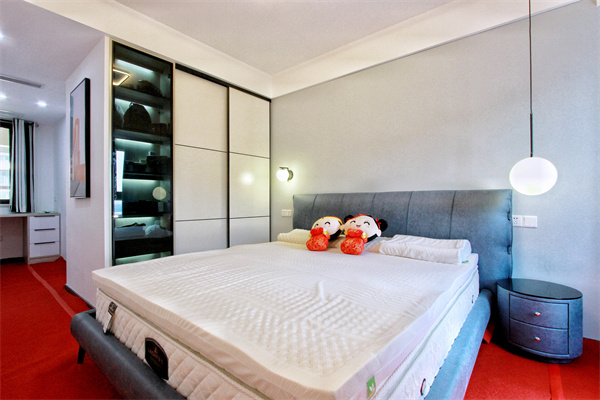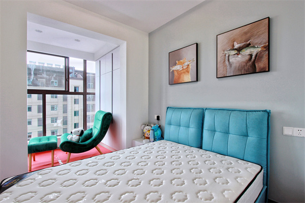 次臥采用單邊床頭柜,充分利用空間,床頭掛畫也是貓咪畫像,清新而溫柔。入門衣柜讓外界與室內(nèi)形成一個過渡設計師將小小空間合理安置,中央空調(diào)美觀且節(jié)約空間。