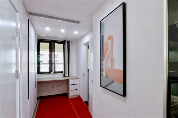 入門的另一端則是小書桌與衛(wèi)生間,正面墻的衣柜將所有衣物整潔收納,同時又與墻面形成整體。