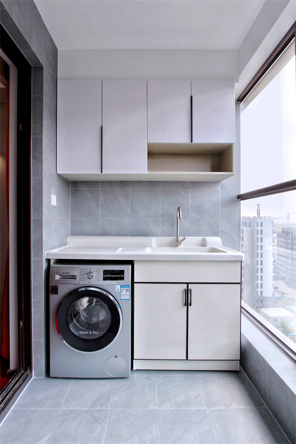 整面落地窗是空間通透明亮,功能性陽臺將洗衣晾曬安置于此,收納柜設計開放格,放上常用物品,整體為純凈的白色調(diào)。