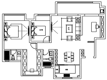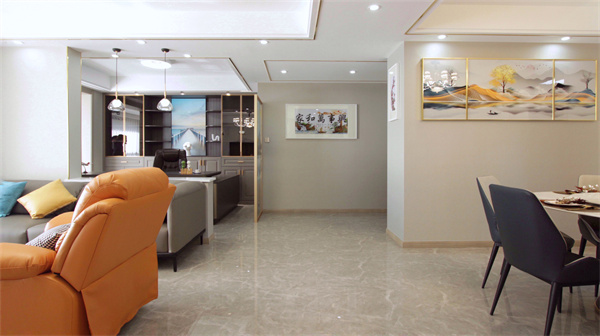 客餐廳地面通鋪灰色大理石地磚,無(wú)線條分隔,整體統(tǒng)一美觀。主燈設(shè)計(jì),吊頂處與沙發(fā)背景加以筒燈處理,增加空間層次感。電視背景墻采用大理石上墻,兩側(cè)增加金屬條邊,突顯品質(zhì),底部電視柜設(shè)計(jì),物件整理有序。整體沙發(fā)搭配異色系窗簾,顯現(xiàn)地面紋理的大理石,增加藝術(shù)感。
