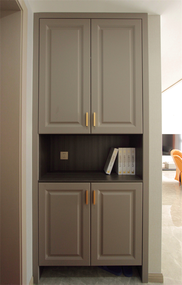 入戶門玄關(guān),輕奢風(fēng)打造,玄關(guān)柜中空隔斷做了收納的設(shè)計(jì),可以用于擺放平時(shí)的鑰匙或是其他生活物品。入戶的位置剛好有一整面墻,做了嵌入式的玄關(guān)柜,即節(jié)省空間又看起來(lái)更大氣。