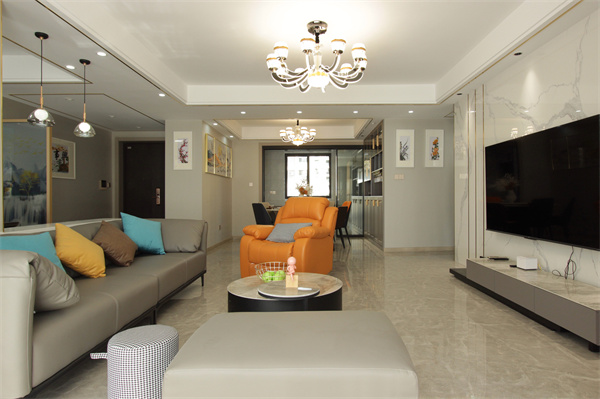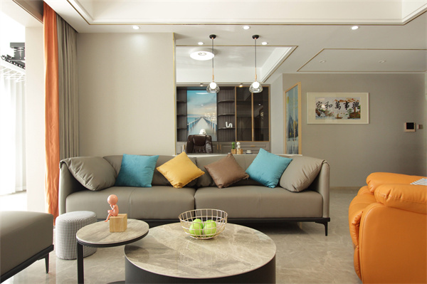 淺灰色的吊柜配合金屬邊框的展示柜,少許的金屬線條讓整個(gè)空間顯得更加精致。配合淺雅的高級(jí)灰基礎(chǔ)色,整個(gè)居室的色彩靈動(dòng)而富有層次。不同色系的抱枕,在灰色調(diào)的沙發(fā)更加凸顯“愛(ài)馬仕”橙的跳躍顏色。