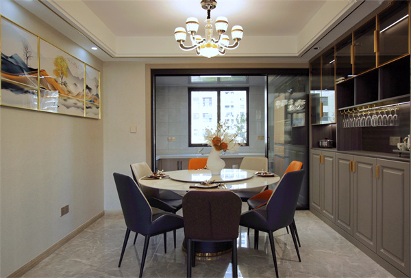 圓形餐桌,搭配主燈設(shè)計(jì),融入深色定制櫥柜,給生活多一些浪漫。餐廳背景墻加以一組山水畫,給精致的空間再增添一筆東方色彩。