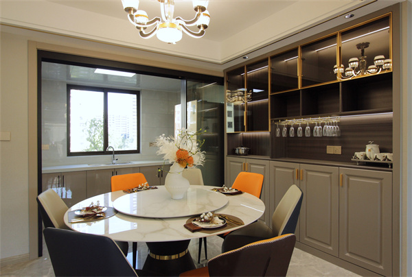 餐邊柜上方采用透明展示格并內(nèi)置燈帶,用于放置業(yè)主自己的紅酒與酒杯。金屬條邊餐邊柜搭配白色系吊頂與墻面,讓空間更有層次感。
