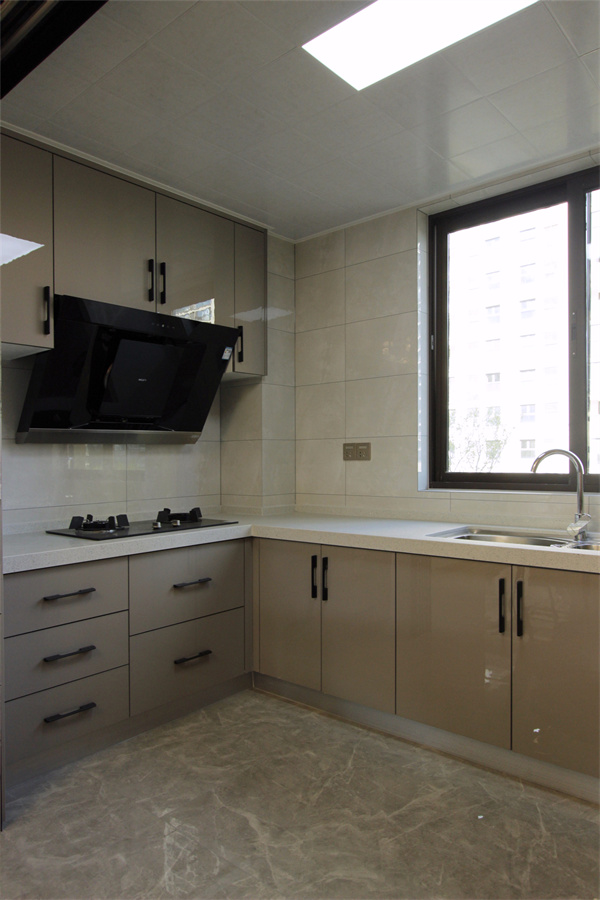 廚房墻面選用瓷磚,美觀實(shí)用也方便打理,L型臺(tái)面布局讓廚房動(dòng)線更為流暢。白色大理石臺(tái)面結(jié)合香檳色櫥柜,高級(jí)又大氣。