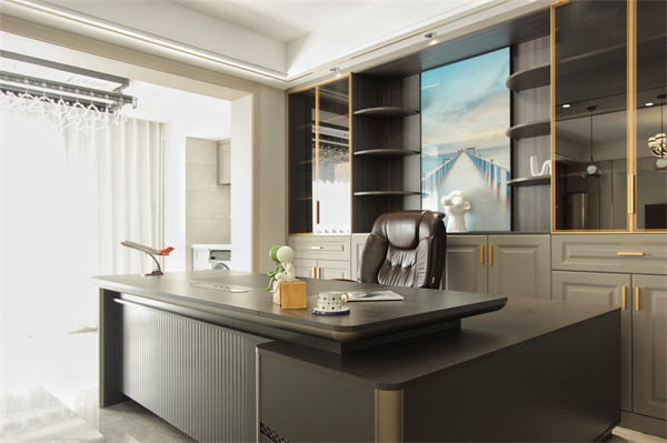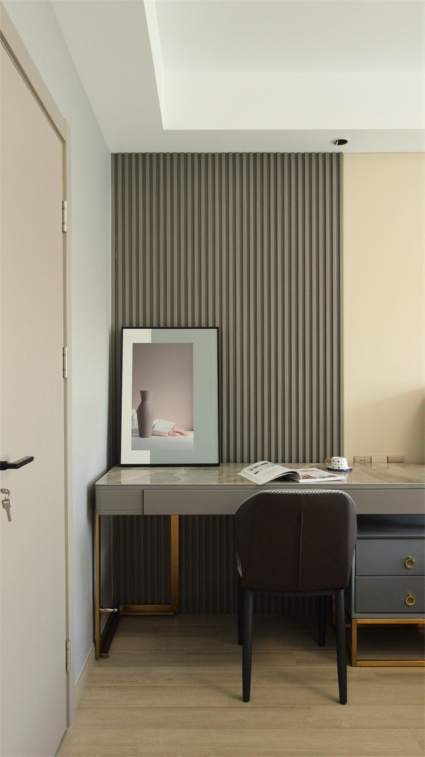 角落擺上梳妝臺(tái),頂部為梳妝臺(tái)留下一盞筒燈,均勻分布光源。多使用金屬、藝術(shù)軟裝、撞色等元素,營(yíng)造臥室精致和品味的輕奢氛圍。