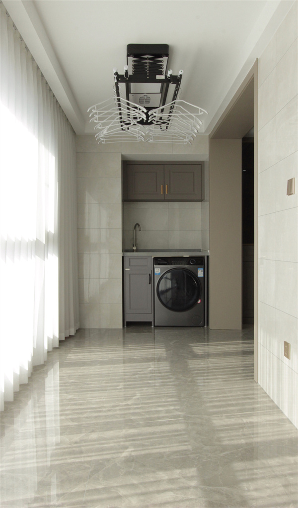 添加嵌入洗衣機(jī)的地柜,陽(yáng)臺(tái)吊柜收納物品,空間干凈整潔。一眼望去的長(zhǎng)廊,擺放躺椅剛好配上悠閑的時(shí)光。