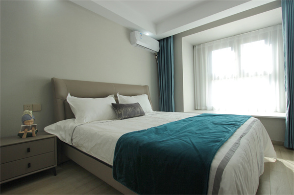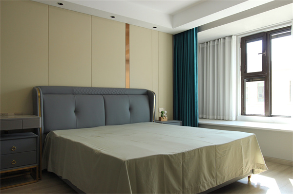 朝南的主臥空間八角窗的設(shè)計(jì),空間大而溫馨;宜{(lán)色床頭搭配同色系格柵,稱應(yīng)金屬條邊現(xiàn)代風(fēng)一下就出來(lái)啦。床體的擺放正好避免了濃烈刺眼的陽(yáng)光照射,也能被溫馨空間所叫醒。