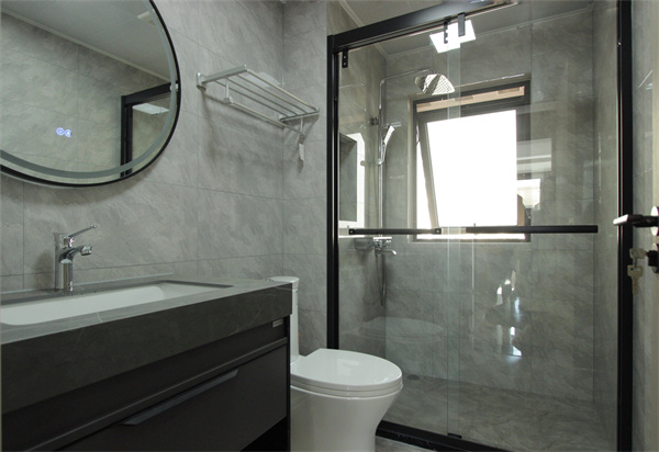 大理石搭配玻璃移門,衛(wèi)生間設(shè)計(jì)給人一種清冷感也整體拉伸了空間。浴室柜顯生活品質(zhì),整體灰色系使衛(wèi)生間不過(guò)于浮夸。